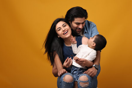 Happy family with baby on yellow background. Mother, father and child