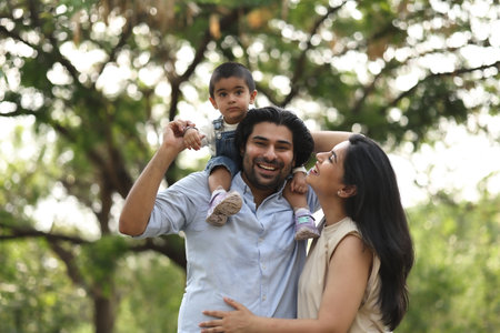 A family of three is the central subject, with a man holding a toddler and a woman smiling. The composition features a shallow depth of field, with the focus on the subjects. Warm colors, including orange and green, and soft lighting suggest a sunny day. This image could be used for various editorial and commercial purposes.