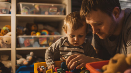 Father and son playing with toys in the children's room at home