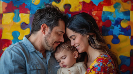 Family portrait for Autism Acceptance Month, symbols of awareness, tender connection