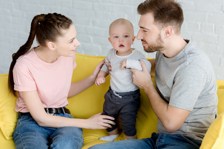 happy family with baby boy sitting on sofa