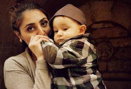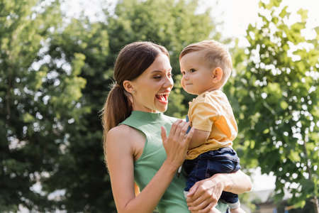 amazed young mother holding in arms toddler son