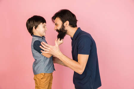 Happy man and little boy, father and son isolated over pink background.