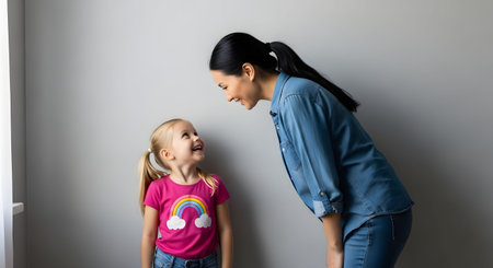 A smiling mother bends forward to be at eye level with her young daughter, who looks back happily. Both are standing against a plain gray wall, capturing a moment of connection, communication, and affection between parent and child.