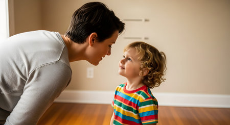 A heartfelt moment where a mother bends down to be at eye level with her young son, smiling at him. They are standing on a wooden floor in a home setting, capturing connection, communication, and positive parenting.
