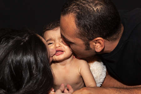 Young parents kiss their crying baby... Family portrait on black background. High quality photo