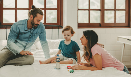 Positive female and male have fun together with their son in bed, enjoy calm domestic atmosphere and togetherness. Family spending free time at home. Attractive young family in the bedroom.