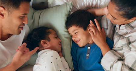 Love, bonding and kids sleeping by their parents in the bed for cuddling in their family house. Sweet, happy and sibling children taking a nap with their mother and father in their bedroom at home.