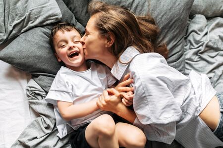 Boundless maternal love. Mom and her cute kid are lying on the bed, mom gently kisses toddler son on the cheek. Top view