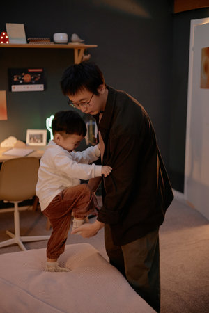 Asian middle aged man helping Asian child climb onto bed in evening home setting, both interacting closely, child standing on edge of bed while man supporting and guiding movement