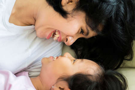 Image of a happy little girl playing with her mother while lying on the couch