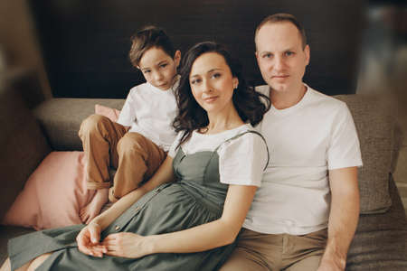 Portrait of happy young family sitting on their couch at living room. High quality photo