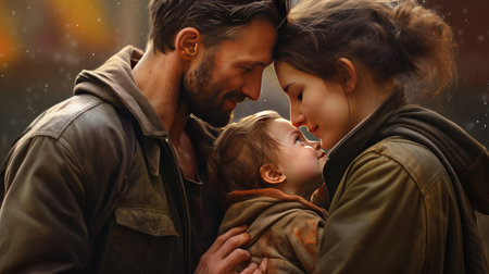 A family of three is the central subject, with a man holding a toddler and a woman smiling. The composition features a shallow depth of field, with the focus on the subjects. Warm colors, including orange and green, and soft lighting suggest a sunny day. This image could be used for various editorial and commercial purposes.
