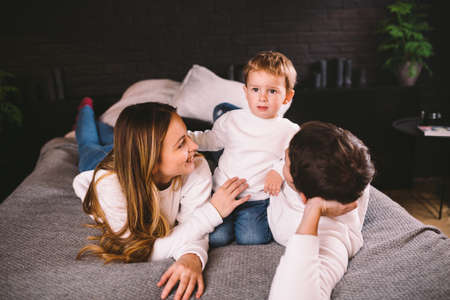 young family mom dad and year-old son on the bed. having fun. love. tenderness