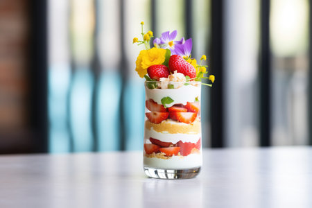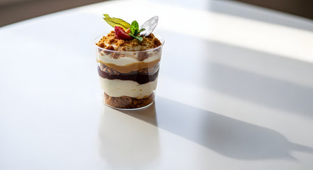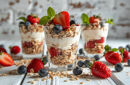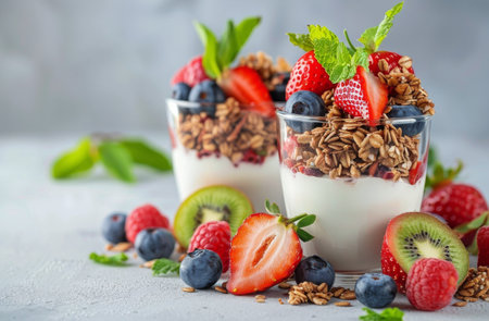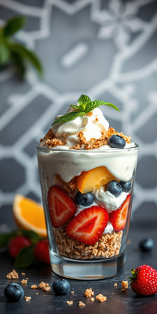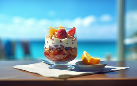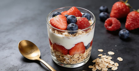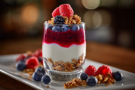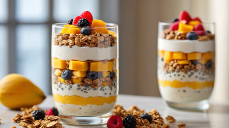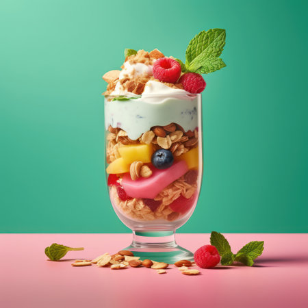Colorful yogurt parfait with fresh fruits and granola in a modern setting