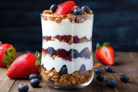 Breakfast parfait made from Greek yogurt and granola topped with fresh berries. Generative AI