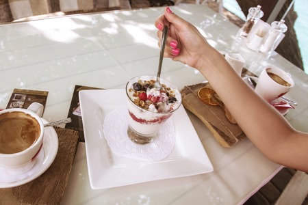 Healthy breakfast in rustic style outdoor yogurt with jam in a glass cup