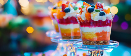 Colorful layers of dessert delight in festive trifles at a vibrant celebration