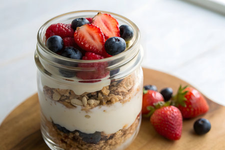 Layers of granola, creamy yogurt, and fresh berries create a colorful parfait served in a glass jar, perfect for a healthy breakfast or snack. Enjoy the blend of flavors and textures.