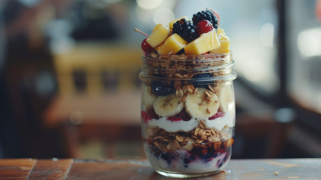 Nutritious breakfast parfait served in a glass jar. Layered Greek yogurt with granola and fresh fruits such as berries, sliced bananas, mango with honey or maple syrup. Healthy breakfast