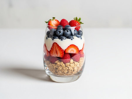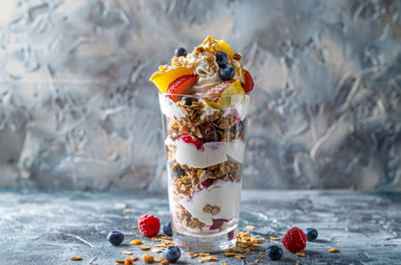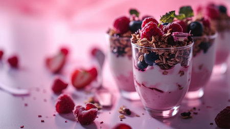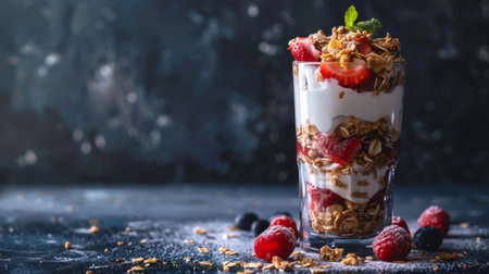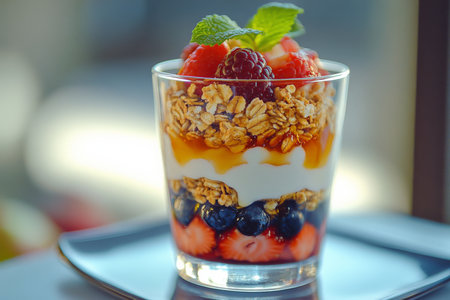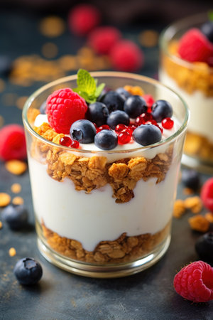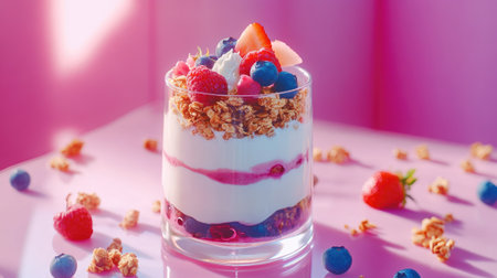 A vibrant yogurt parfait featuring layers of creamy yogurt, crunchy granola, and fresh berries, perfect for a healthy snack or breakfast option.