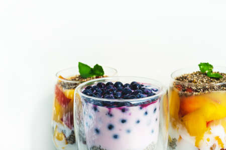 Fresh dairy summer dessert cream closeup on white background copy space. Sweet raw blueberry, peach, fruit breakfast. Chia seeds organic pudding mousse. Vegan fresh coconut, almond vegetable milk food