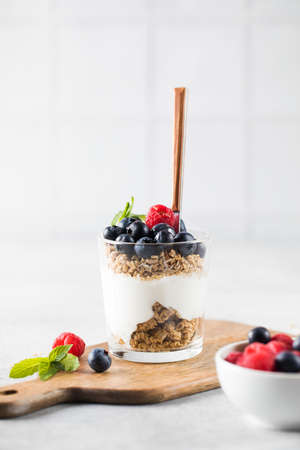 Healthy breakfast with yogurt, muesli and berries in glass