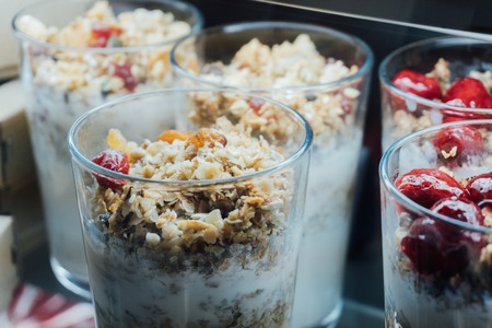 Granola with yogurt in glass cups, delicious homemade granola using glass. fruit granola
