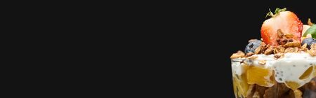 fresh granola with canned peach, berries, walnuts and chia seeds isolated on black, panoramic shot