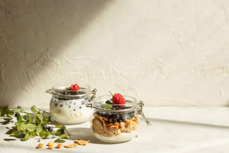 Glass with granola, yogurt, fresh strawberries and blueberrys on white table. Healthy breakfast bowl concept.
