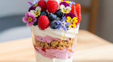 A glass of yogurt parfait layered with granola and fruit puree is topped with fresh raspberries, blueberries, strawberries, and colorful edible flowers. Honey drips down the side, making for a beautiful and healthy breakfast treat.