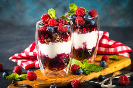 Delicious berry parfait with granola and yogurt in a glass