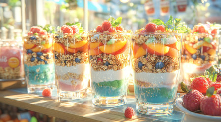 Colorful yogurt parfaits feature layers of creamy yogurt, vibrant fruits, and crunchy granola arranged in elegant glasses, all set against a sunny outdoor backdrop, perfect for dessert lovers.