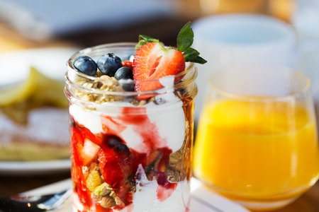 healthy breakfast idea: crunchy homemade granola with organic yogurt, fresh berries and jam served with freshly squeezed orange juice