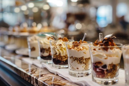 Desserts in glasses with napkins in a cafe setting. Sweet snacks in glasses with blurred background. Generative AI