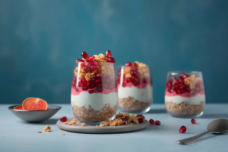 Pomegranate parfait dessert. Granola diet food. Generate AI