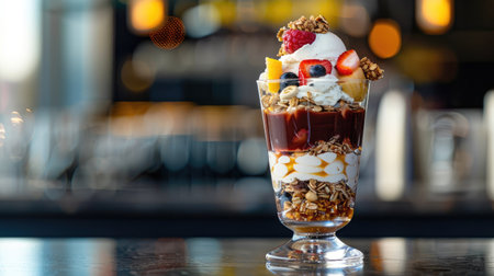 An ice cream parfait layered with fruits, granola, and yogurt, served in a tall glass.