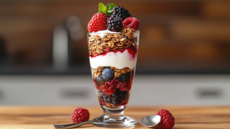 A delicious berry parfait layered with yogurt, granola, and fresh berries, served in a tall glass, with a spoon placed beside it on a wooden surface.