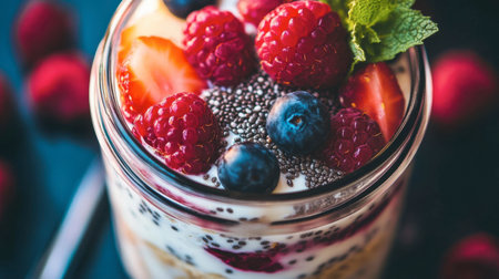 A close-up of a jar of overnight oats, layered with chia seeds, yogurt, and berries, ready for breakfast.