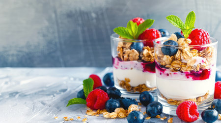 Healthy breakfast or snack idea featuring layered yogurt parfaits in glass cups, filled with creamy yogurt, crunchy granola, and fresh berries including strawberries, raspberries, and blueberries. The clean background and bright lighting create a modern, appetizing look ideal for food advertising and health-focused promotions.