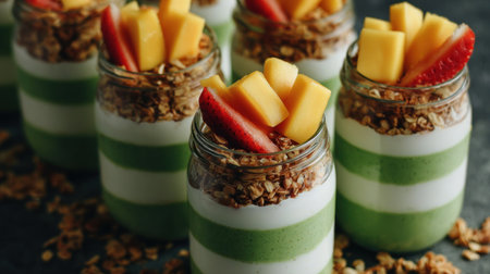 , focused shot features several small glass jars lined up, each filled with alternating layers of a bright green mixture and white creamy substance, topped with a layer of crunchy brown granola, chunks of yellow fruit, and slices of red fruit, set against a dark, textured surface.
