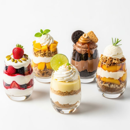 Assorted fruit and cream dessert parfaits in glass cups