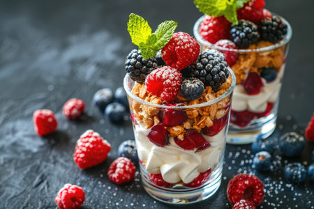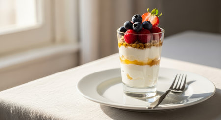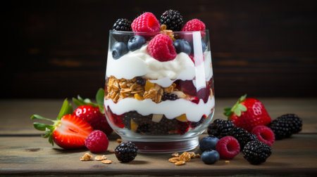 A delightful yogurt parfait featuring layers of creamy yogurt, crunchy granola, and an assortment of fresh berries, ideal for a healthy breakfast or snack.