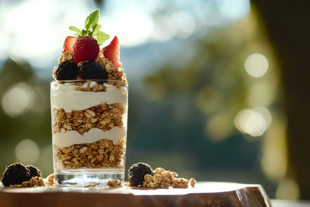 Granola parfait layered with yogurt and topped with fresh berries and mint, enjoying the warm glow of morning sunlight