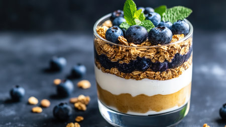 A tempting parfait featuring layers of creamy yogurt, crunchy granola, and fresh berries, garnished with mint leaves. Perfect for a nourishing breakfast or dessert.
