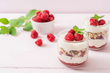 Yogurt parfait with red fruits. Dessert based on yogurt, raspberries and pomegranate. Healthy sweet dessert