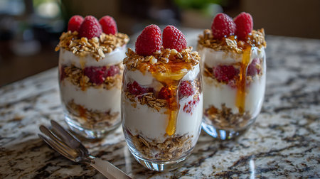 Greek yogurt parfait with granola, raspberries and honey