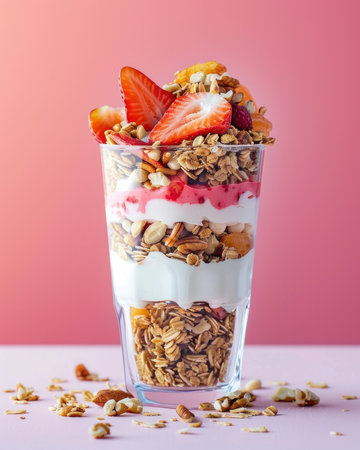 A delicious dessert consisting of yogurt, granola, and strawberries served in a glass on a pink table, perfect for a sweet treat or breakfast option