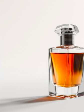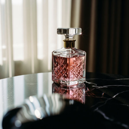 A beautiful glass perfume bottle sits elegantly on a marble surface, reflecting soft light and casting gentle shadows. Ideal for beauty and lifestyle themes.