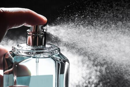 Close up of glass bottle of male perfume on dark background. Style perfumery template.